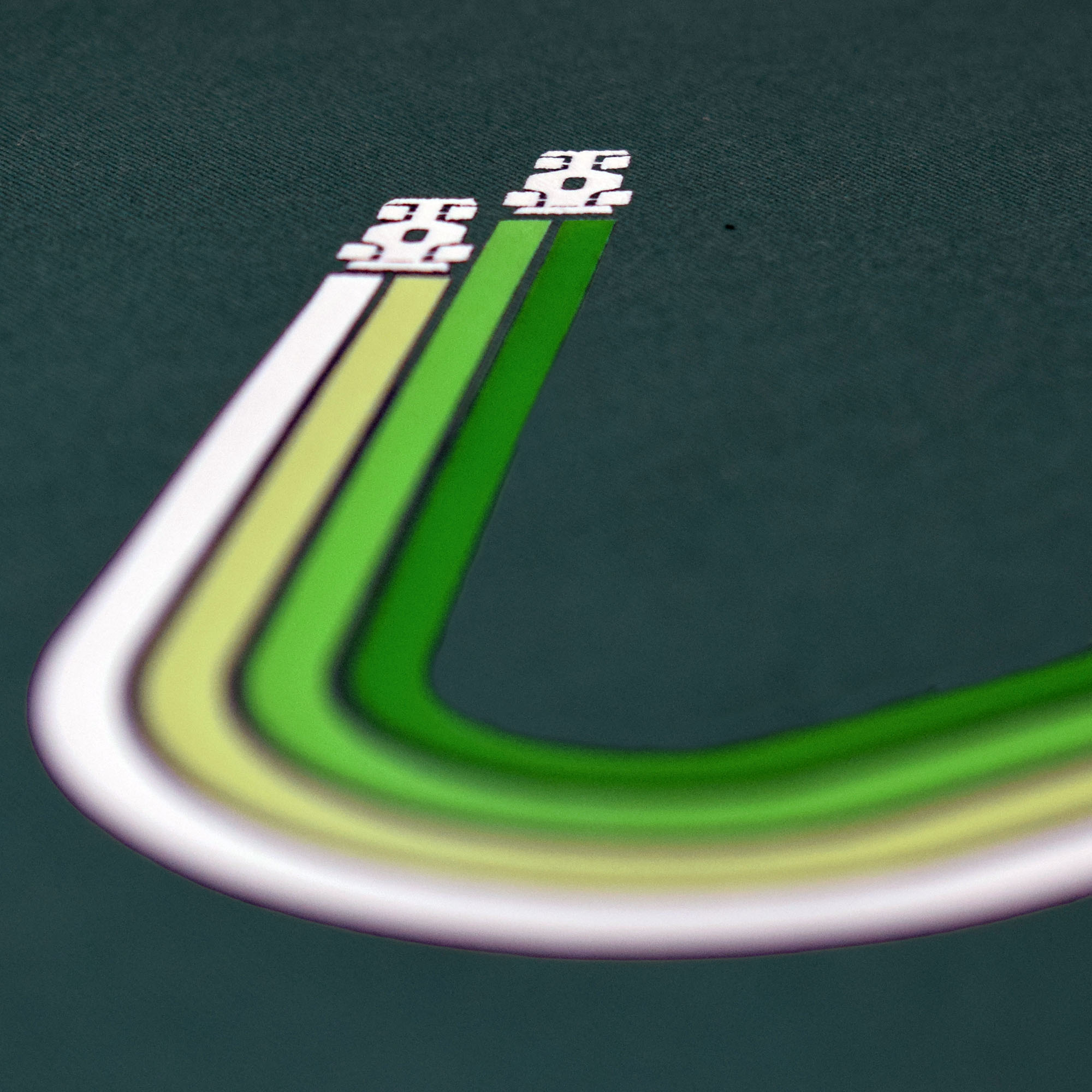 A sleek homage to the thrill of motorsport. The bold, swooping stripes evoke style and speed, with two drivers locked together giving and expecting no quarter.