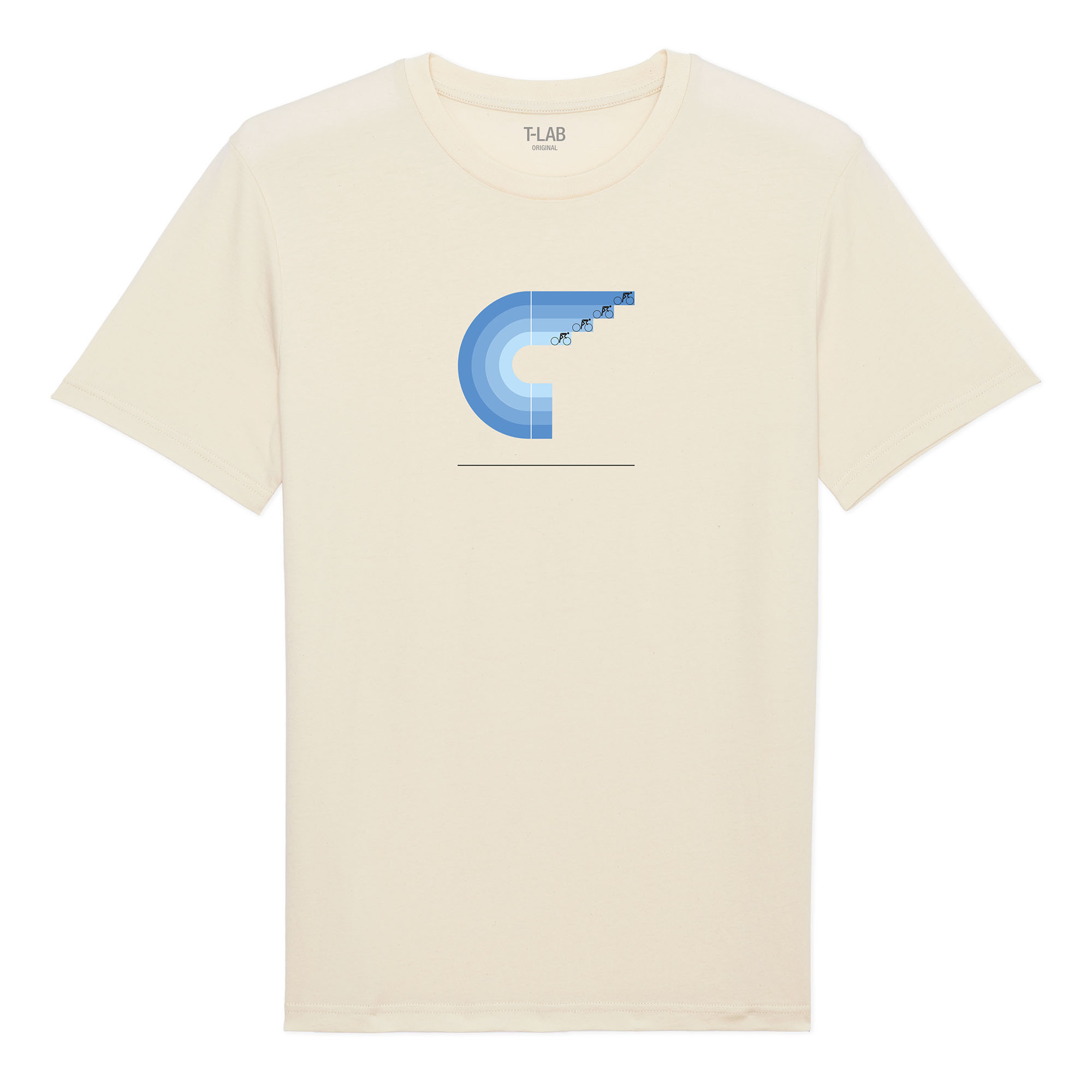 Soft layered blues onto a cream natural white t-shirt offer a distinctly different cycling design that’s perfect for summer.